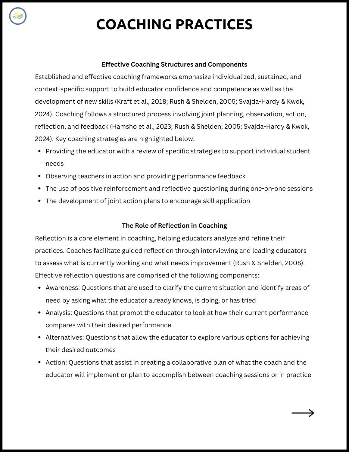 Established and effective coaching frameworks emphasize individualized, sustained, and context-specific support to build educator confidence and competence as well as the development of new skills (Kraft et al., 2018; Rush & Shelden, 2005; Svajda-Hardy & Kwok, 2024). Coaching follows a structured process involving joint planning, observation, action, reflection, and feedback (Hamsho et al., 2023; Rush & Shelden, 2005; Svajda-Hardy & Kwok, 2024). Key coaching strategies are highlighted below: